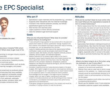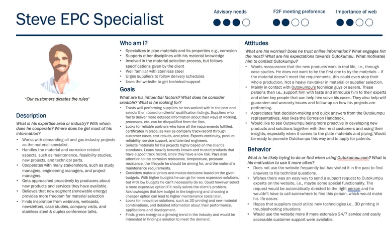 A multi-industry customer insight project for Outokumpu, focused on understanding audience behaviors, needs, and motivations across sectors such as Oil & Gas, Bridges, Automotive, and Storage Tanks. Through research and interviews, we developed four detailed personas, mapped their customer journeys, and created value maps to help stakeholders align communication, channels, and relationship strategies more effectively.